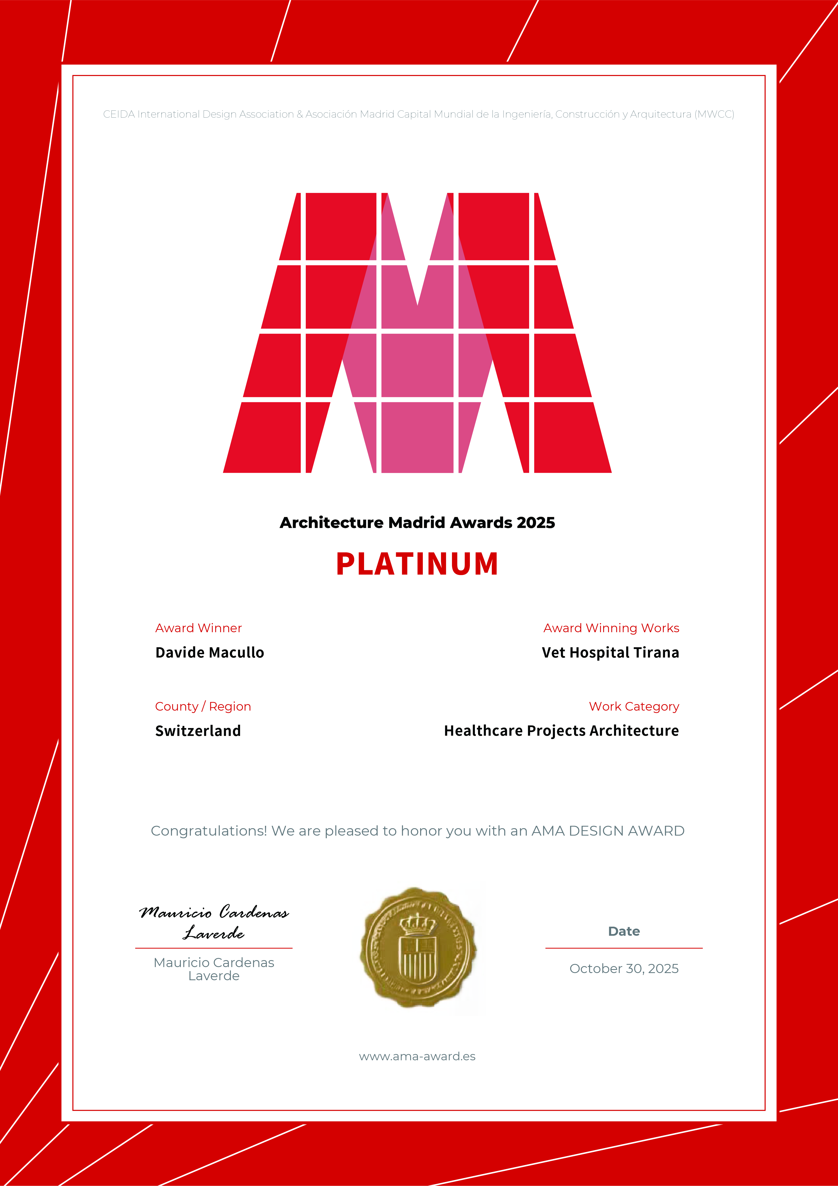 30.10 VET HOSPITAL TIRANA PLATINUM WINNER AT ARCHITECTURE MADRID AWARDS 2025